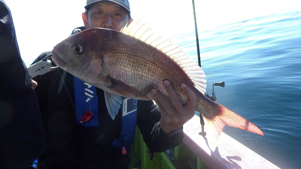いよいよ春のイワシ到来か。ポイントに着くとうねりあり。風も程よく吹いて船も流れる。天候も良く気持ちよい釣り日和だ。アタリは少ないがポツンポツンと今日は2k台のマダイが見える。10時ころまでに皆さん鯛の顔が見れた。