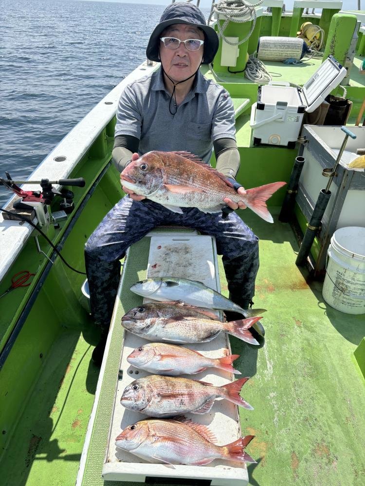『マダイ五目船。水深:40M〜70M。潮色と流れ…