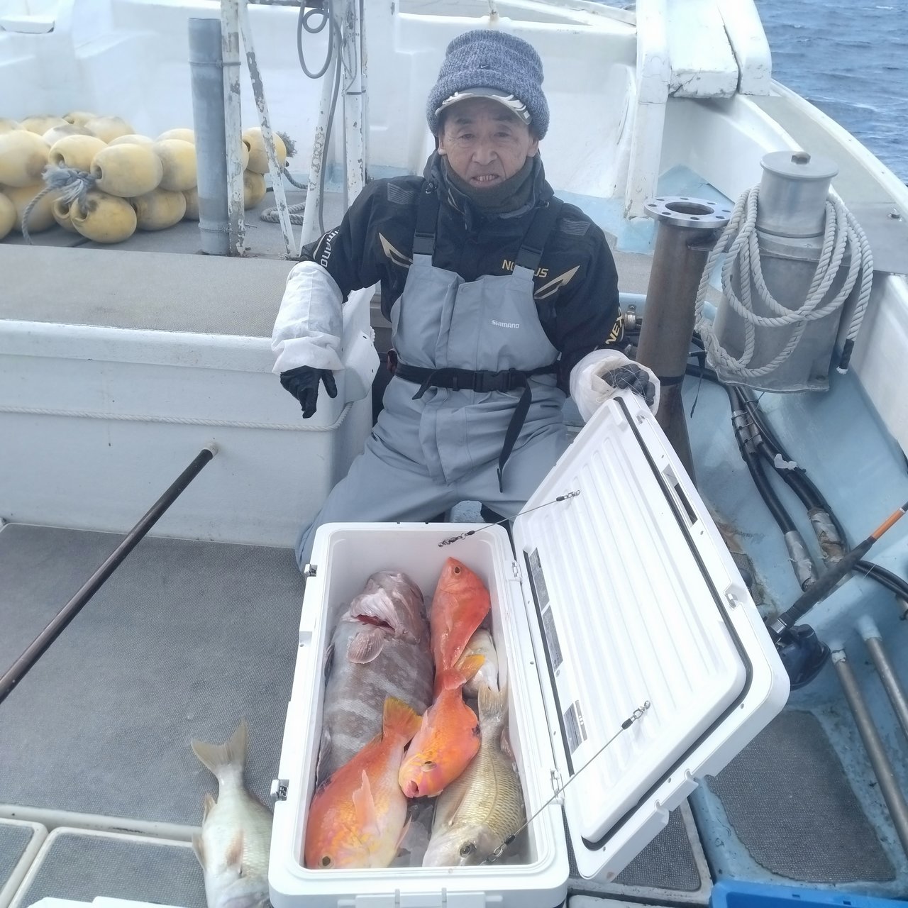 『天びん五目釣り。皆さん楽しく良く釣れました(笑)マダイ2〜5kタカバ2〜5.5kヤズ2〜3kイサキ25〜40cm。』